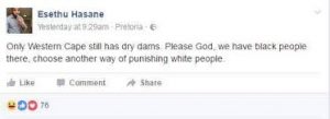 Die omstrede woordvoerder van die Departement Sport en Ontspanning, Esethu Hasane, sê sodra die onteieningswetgewing deur president Jacob Zuma onderteken is gaan hy `n plakkershut heel bo op Tafelberg oprig. Hasane is in die sop na `n omstede plasing op Twitter.